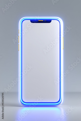 Smartphone sits upright on sleek grey surface with vibrant neon outline illuminating its edges. Clean design emphasizes technology and innovation. Concept of mobile devices, tech retail, advertising