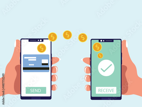 Smartphones in the hand with money and credit card on a screen online money transfer concept Vector illustration.