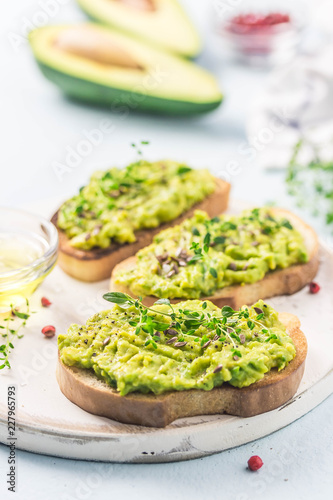 Smashed avocado sea salt and herbs toast. Selective fcous, space for text.