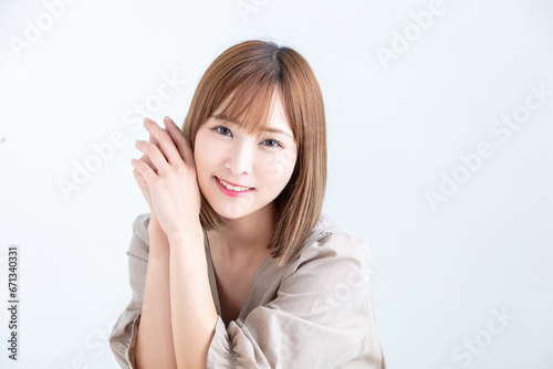 woman, white background, copy space, portrait, beauty, smile, cosmetic, sweet, asian, pretty, beauty, waist up, pretty, face, smile, coiffure, brown-haired, clean, lovely