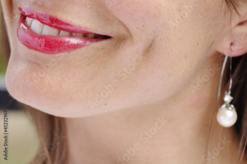 smile, detail, body part, mouth, teeth, dental care, face, earing, pearl, seduction, relaxed, seductive, alluring, unrecognizable, chin, femininity, lip, lipstick, red, cosmetic, beauty