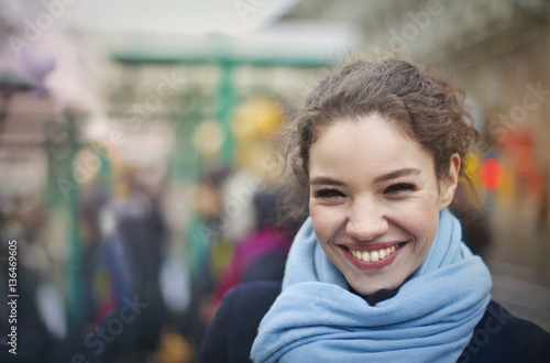 woman, girl, female, young, smile, city, blur, background, crowd, people, person, colours, foulard, winter, happiness, laugh, travel