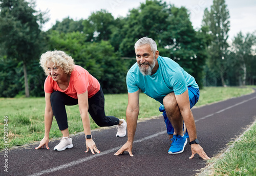 Smiling active mid aged couple standing in start position, jogging running and walking doing fitness in the park