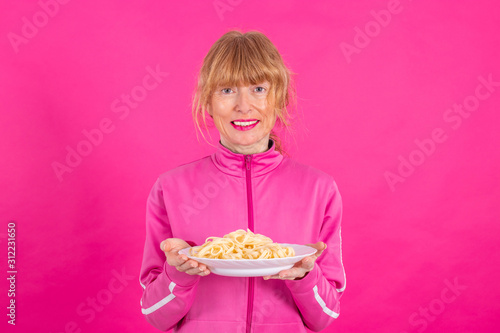 woman, adult, smiling, eat, pasta, sport, activewear, background, female, beauty, senior, elder, elderly, isolated, well-being, dish, holding, fun, person, blond, thin, fashion, wellness, calorie, slimming, menu, eatery, regime, snack, hunger, appetence, italy, macaroni, latin, german, photogenic, happy, positive