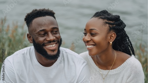 smiling, african, adult, together, male, female, couple, happiness, joy, nature, leisure, casual attire, friendship, connection, bonding, clothing, serene, peaceful, human relationships, companionship, love, affection, grassy, background, warm, oneness, closeness, harmony, relaxed, content, earring, necklace, sweater, beard, coiffure, curl, lake, waterfront, hugs, autumn, calmness, interaction, friendly, pose