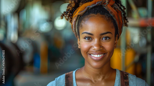 Smiling African American female construction apprentice in workshop, daytime, positive mood, career development in construction industry, young black woman in trades, vocational training