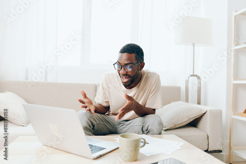 laptop, man, freelancer, african american, sofa, working, smiling, education, cyberspace, technology, computer, home, modern, typing, lifestyle, job, business, sitting, student, indoor, african, guy, cyberspace, online, happy, black, couch, businessman, ethnicity, looking, chat, work, communication, person, call, employee, living room, relaxing, room, watching, casual attire, freelance, adult, alone, american, apartment, male, blissful