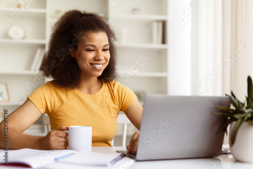 Smiling African American student woman studying at home with laptop, cheerful black female holding white mug and looking at computer screen, appearing calm and focused in cozy, well lit room