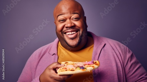 Smiling afro plus size man savoring a pizza slice against a studio backdrop.