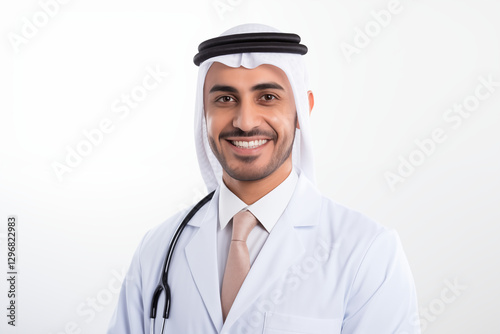medical professional, white coat, stethoscope, health care, physician, middle eastern, hospital, clinic, white background, doctor's appointment, wellness, diagnosis, treatment, general practitioner
