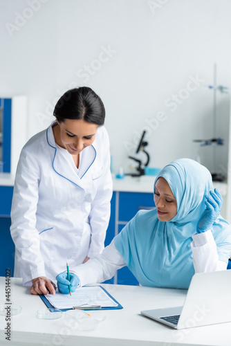 Smiling arabian scientist writing on clipboard near laptop, colleague and petri dishes