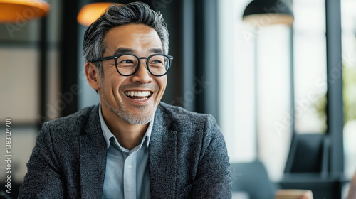 Smiling Asian businessman with glasses in modern office environment.