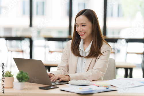 asian woman, businesswoman, laptop, working, office, smiling, happy, desk, computer, professional, female, business, entrepreneur, confident, cheerful, workplace, indoor, young, adult, person, technology, communication, job, career, finance, accounting, paperwork, document, calculating machine, modern, interior, table, sitting, typing, positive, successful, achievement, corporate, employee, manager, executive, occupation, lifestyle, sharpened, concentration, diligence, productivity, efficiency