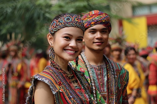 Smiling Asian woman and man in colorful tribal dress with beaded jewelry and headdress during outdoor cultural gathering.