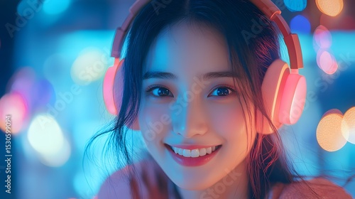 woman, earphones, smile, professional, tech, communication, technology, studio, lighting, blue, pink, portrait, female, digital, electronic, entertainment, happiness, joy, positive, modern, beauty, make-up, coiffure, asian, confident, service, assistance, friendly, client, expression, emotion, urban, city, lifestyle, people, business, corporate, culture, diverse, career