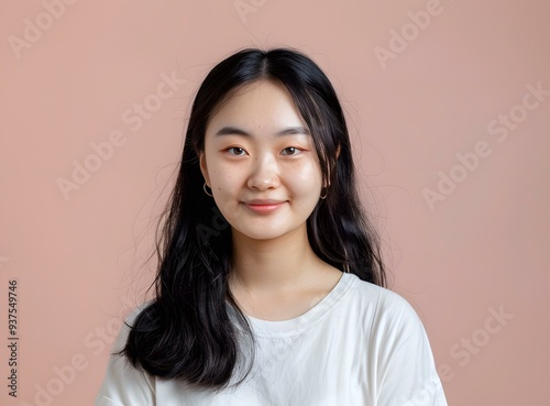 woman, asian, female, portrait, smile, hair, long, black, face, eye, person, people, model, studio, background, pink, colours, beautiful, happy, fashion, beauty, style, natural, young, casual attire, girl, confident, pose