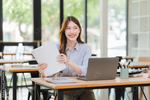 asian woman, businesswoman, office worker, laptop, smiling, cheerful, paperwork, business, working, desk, office, young adult, female, happy, positive, confident, professional, entrepreneur, startup, bright, light, workspace, workplace, indoor, interior, corporate, job, occupation, career, success, achievement, planning, strategy, analysis, report, document, technology, computer, screen, digital, communication, connection, learning, studying, education, student, university