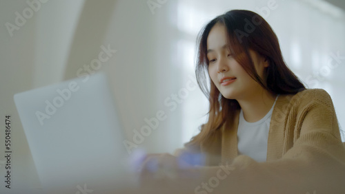 Smiling asian young woman working on laptop at home office. Young asian student using computer remote studying, virtual training, e-learning, watching online education webinar at house