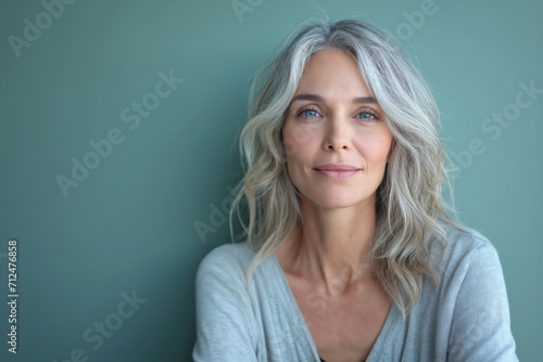 woman, portrait, white, grey, hair, mature, isolated, blue, background, beautiful, attractive, natural, care, love, self, health, ageing, female, copy space, harmony, balance, peace, pacification, relax, happiness, elegant, modern, person, cream, facial, 1, people, lady, age, 30, 40s, head shot, stylish, face, year, successful, charming, honed, lifestyle