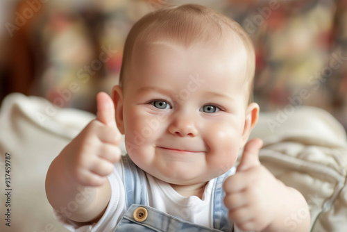 baby, smile, thumb up, happy, cheerful, portrait, closeup, infant, adorable, cute, positive, blue eye, gesture, approval, happiness, expression, children, content, playful, fun, innocent, young, toddler, face, joyous, engaging, sweet, emotion, enjoyment, candid, charming, pleasing, optimistic, satisfaction, delight, glee, enthusiasm, contentment, blissful, gleeful, eye contact, generative, ai, illustration