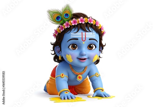 krishna, indian, deity, god, baby, cartoon, illustration, religion, spiritual, culture, hindu, avatar, mythology, art, bliss, happiness, joy, peace, vibrant, colourful, blue, yellow, peacock, feather, crown, flower, floral, garland, ornament, gold, jewellery, smiling, cute, adorable, playful, cheerful, happy, character, children, innocence, divine, prayer, devotion, festival, celebration