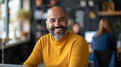 Smiling bearded man in a yellow sweater at a modern co-working space