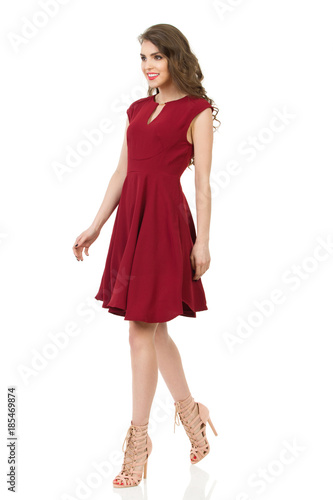walking, red, dress, happy, smiling, woman, front view, half face, full-length, looking away, watching, high heel, elegant, profile, march, positive, attractive, long hair, beautiful, confident, femininity, slim, simple, style, young, studio, people, isolated, cut-out