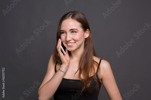 woman, young, grey, background, girl, expression, emotion, portrait, dark, communication, conversation, person, technology, phone, mobile, mobile phone, happy, female, brunette, adult, beautiful, communicate, 1, pretty, talking, people, student, college, cute, adorable, beauty, call, casual attire, speaking, phone, attractive, camera, caucasian, cheerful, helpline, joy, listen, satisfied, service, smiling, studio, wireless, tied-up