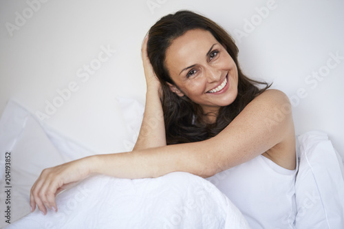 Smiling beauty in bed, portrait