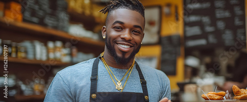 man, black, smiling, friendly, cafes, hot drink, shop, shopkeeper, employee, small, business, entrepreneur, owner, portrait, happy, professional, confident, positive, cheerful, casual attire, light, blue, shirt, dark, apron, gold, jewellery, stylish, fashion, client, service, attentive, helpful, warm