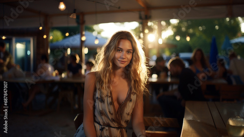 smiling blonde at restaurant table, surrounded by people, joyful dining