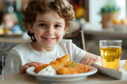boy, smiling, happy, meal, food, plate, curly, hair, eating, eatery, table, children, young, adorable, cute, joyful, dinner, lunch, breakfast, delicious, tasty, ravenous, enjoying, white, shirt, casual attire, sitting, wooden, background, indoor, family, children, healthy, drink, glasses, juice, yellow, brown, orange, green, natural