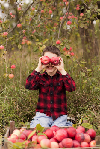 smiling, boy, holding, red, apple, eye, crate, 1, people, children, group, preschool, toddler, ukraine, outdoors, freshness, healthy, nourishment, box, season, pile, object, obscured, face, fruit farm, garden, autumn, playfulness, grass, plant, organic, product, caucasian, colours, farm, lifestyle, nature, abundance, growth, covering, mischief, harvesting, harvest, agricultural, work, fruit, food, male