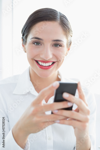 20s, young adult, woman, female, caucasian, indoor, closeup, businesswoman, holding, brown hair, brunette, lifestyle, technology, wireless, leisure, phone, communication, connection, mobile phone, smartphone, mobile phone, touch screen, touching, selecting, smiling, happy, beautiful, text, messaging, text message, texting, dialling, typing, text messaging, well-dressed, smart, elegant, posh, stylish, shirt, white