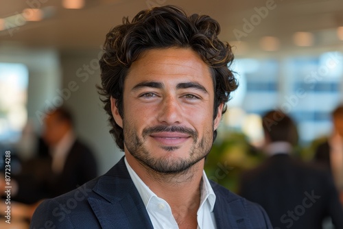 Smiling businessman in a suit and tie, standing indoors. Professional and confident, with blurred office background.