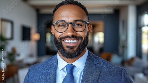 man, portrait, happy, smile, goggles, suit, professional, businessman, office, success, confident, men at work, employee, job, career, corporate, executive, leader, team, management, business, marketing, finance, sale, adult, male, model, person, face, expression, photogenic, attractive, stylish, fashion, apparel, clothing, attaching, shirt, beard, black, african, american, ethnicity, diversity, indoor, home, house, background, modern