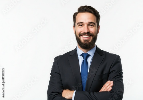 Smiling businessman with beard in suit and tie stands with arms crossed on white
