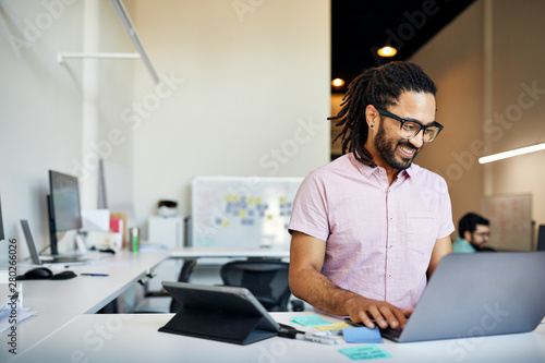 businessman, laptop, dreadlocks, desk, office, smiling, businessperson, occupation, eyeglass, business, entrepreneur, technology, looking, communication, standing, startup, confidence, small business, wall, portability, beard, coiffure, working, connection, happiness, wireless technology, selective focus, copy space, expertise, new business, front view, waist up, indoor, day, one person, male, mixed race