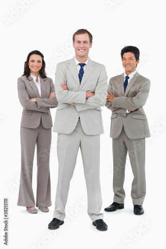20s, 30s, arm, associate, boss, business, businessman, businessperson, businesswoman, caucasian, colleague, company, cooperation, corporate, crossed, elegant, executive, executive, folded, formal, happiness, happy, isolated, line, man, manager, meeting, occupation, partner, partnership, professional, row, smile, smiling, staff, standing, suit, team, teamwork, three people, together, white background, woman, men at work, young