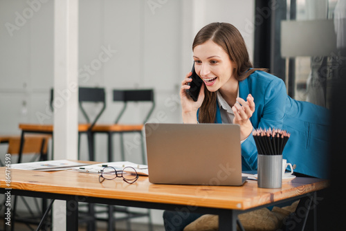 Smiling businesswoman in blue blazer talking on phone and working on laptop at desk in modern office.