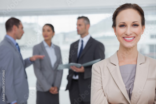 Smiling businesswoman posing while colleagues talking together