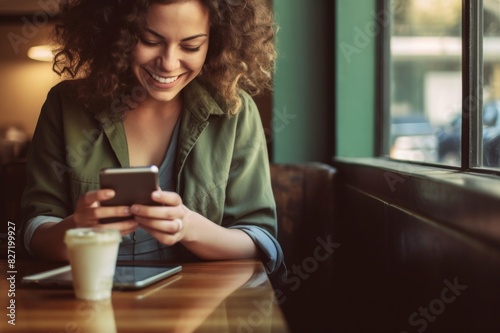 smiling caucasian woman sitting at a cafe and checking social media on her mobile phone