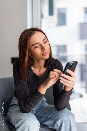 Smiling caucasian woman use smartphone sitting on armchair in bright living room.