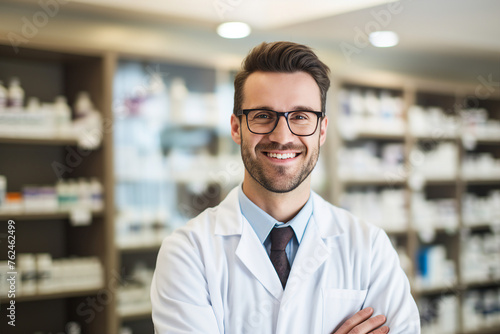 Smiling cheerful confident pharmacist in drugstore store shop Generative AI