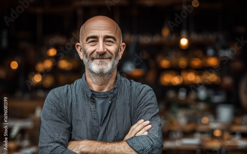 Smiling Chef in an Inviting Kitchen With Warm Lighting and Cozy Atmosphere During a Busy Evening.
