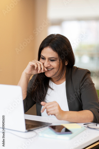 Smiling confident Indian woman using laptop computer having video call in office. Successful asian freelancer working online sitting at workplace. Modern technology, video conference concept
