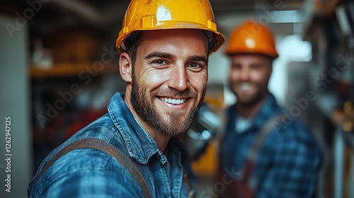 Smiling construction worker, colleague blurred, warehouse. Industrial teamwork image