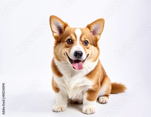 dog, cute, puppy, happy, panting, sitting down, indoor, white background, adorable, fluffy, smiley, cuddly, joyful, playful, relaxed, content
