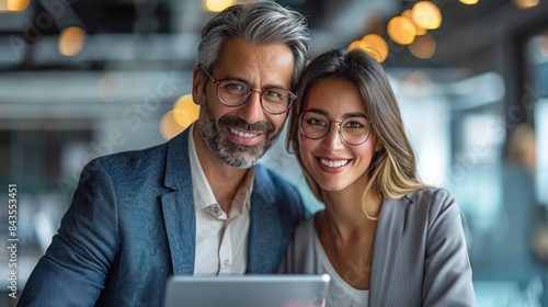 Smiling couple working together, using a tablet computer in a modern cafe