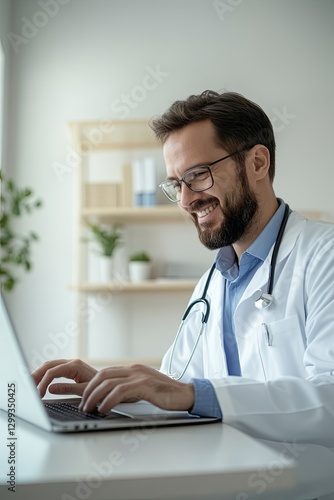 doctor, consultation, laptop, health care, smiling, professional, technology, modern, office, medicine, wellness, communication, workspace, male, interaction, patient, digital, friendly, research, healthcare professional, productivity, health, support, innovation, sharpened, equipment, contemporary, medicals, lifestyle, information, assistance, care, expertise, networking, virtual, service, connection, analysis, approach, system, strategy, teamwork, efficiency